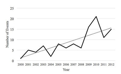 Active shooter incidents are incredibly frightening events that often have deadly consequences for individuals, and dire consequences for organizations. The term “active shooter” describes a “situation in which a shooting is in progress and an aspect of the crime may affect the protocols used in responding to and reacting at the scene of an incident” (Blair & Schweit, 2014, p. 4). Most government agencies in the U.S. define “active shooter” as an “individual actively engaged in killing or attempting to kill people in a confined and populated area” (Blair & Schweit, 2014, p. 5). Since they have been studied, active shooter incidents have been steadily increasing over the years (Figure 1), causing increasing numbers of casualties, including many who have been killed or wounded (Blair, Martaindale, & Nichols, 2014; Blair & Schweit, 2014). Figure 1: Active Shooter Events by Year